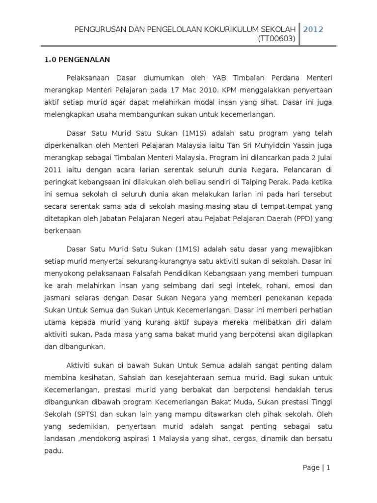 Antara kandungan modul ini ialah. Kementerian Pelajaran telah melancarkan Dasar 1Murid 1Sukan pada 9 Jun 2011 yang menjadi serampang dua mata bagi melengkapkan skop pembangunan sukan sekolah dalam melahirkan pelajar seimbang dari segi jasmani emosi rohani dan intelek. Up to 24 cash back BAB 1 DASAR 1 MURID 1 SUKAN 11 Pengenalan 7 12 Rasional 7 13 Matlamat 8 14 Konsep 8 BAB 2 PENGURUSAN KELAB SUKAN 21 Pengenalan 10 22 Penubuhan Kelab Sukan 10 23 Organisasi Kelab Sukan 13 24 Bidang Tugas Jawatankuasa Kelab Sukan 14 BAB 3 LATAR BELAKANG SUKAN SEPAK TAKRAW 31 Sejarah Dan Perkembangan 17.